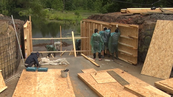 Эта плотина разделяет Холодный и Теплый пруды в Высоковске. Она была построена практически 100 лет назад для нужд прядильно-ткацкой фабрики. И довольно давно это строение нуждалось в реконструкции. В начале лета текущего года на место капремонта вышел подрядчик. Здесь очистили дно, вывезли мусор, залили бетоном нижнюю часть водосбросного канала.
