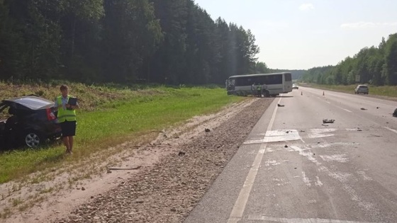 Столкновение автомобиля Renault Logan и автобуса произошло 24 июля в 14:00 на 39 километре трассы Йошкар-Ола – Уржум.
