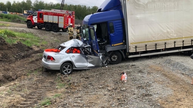 Судя по фото с места аварии, оба авто съехали с трассы в кювет, где переднюю часть легковушки полностью смяло. Вероятно, у ее водителя не было шанса выжить. Фура с двойным прицепом при этом частично перегородила проезд по трассе.