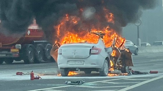 Загоревшийся на МКАД легковой автомобиль попал на видео. Об этом в воскресенье, 7 августа, сообщает пресс-служба департамента транспорта Москвы.
