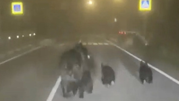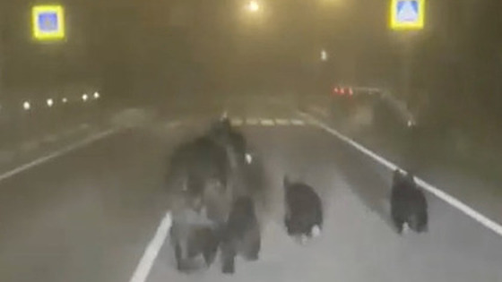 Медведица с тремя медвежатами вышла на трассу на Сахалине