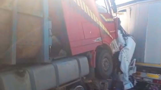 В результате удара маршрутка врезалась в стоявший впереди грузовик, автобус буквально превратился в гармошку между двумя фурами.