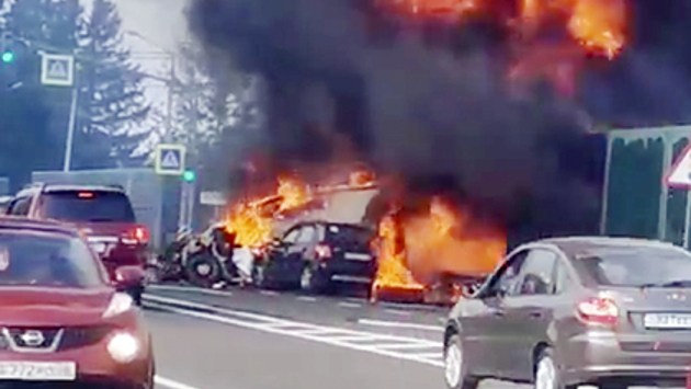 На появившемся видеоролике видно, как трасса объята огнем, на месте смертельного ДТП работают спасатели и пожарные.