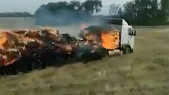 Водитель грузовика с полуприцепом, наполненным горящим сеном, двигался по полю в Воронежской области. Видеозапись инцидента, сделанная свидетелем происшествия, появилась в Telegram-канале "Осторожно, новости". По его данным, в машине перевозили 32 тюка сена массой по 300 кг каждый. Груз загорелся по неизвестной причине, а водитель автомобиля, заметив пожар, съехал с трассы и позвонил спасателям. В результате сено было уничтожено огнем, сам водитель не пострадал. На видеозаписи инцидента видно, как автомобиль с горящим грузом на большой скорости едет по краю поля около насыпи, по которой проходит автомобильная дорога. Ранее в Краснодарском крае женщина, попавшая под трактор, осталась жива, но погибла в ДТП по дороге в больницу.
