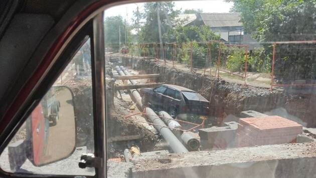 На ул. Корецкой в яму для прокладки трубопровода съехала «Лада». Фото с автомобилем опубликовали в социальных сетях 5 сентября.