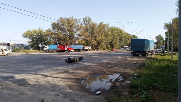 По предварительным данным, водитель 1971 года рождения ехал за рулем КамАЗа с полуприцепом и при повороте налево не успел занять крайний ряд, сбив двигающегося в попутном направлении мотоциклиста 1998 года за рулем «Сузуки».