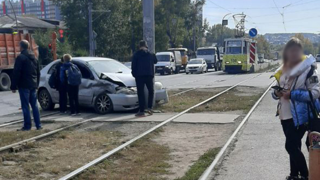 Иномарка в Кемерове врезалась в опору на трамвайных путях после ДТП