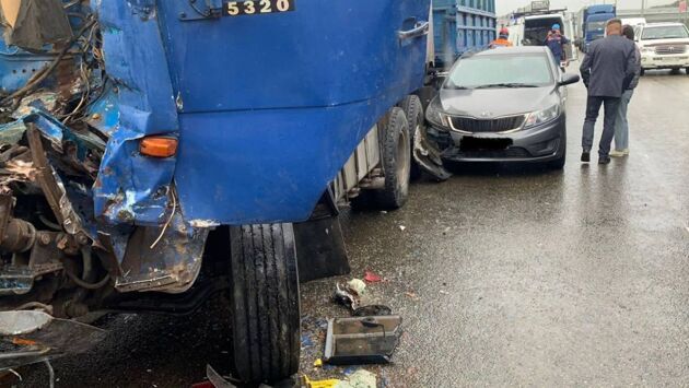 После столкновения КАМАЗ 5320 продолжил движение по инерции и допустил наезд на металлическое барьерное ограждения справа по направлению движения, а затем допустил столкновение со стоящим полуприцепом БОНУМ, в составе автомобиля КАМАЗ 5490-S5, под управлением 37-летнего водителя.