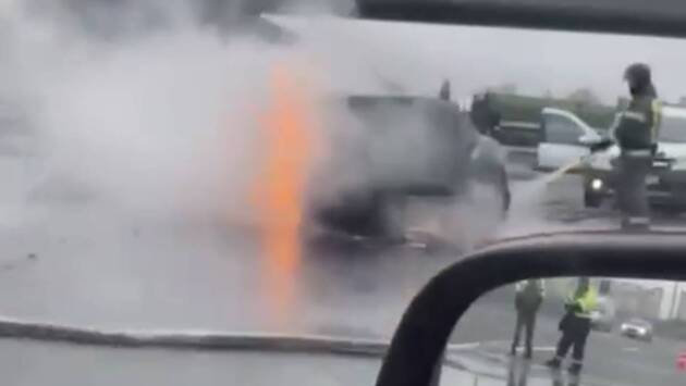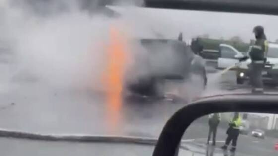 Сам пожар попал на видео: на кадрах, снятых проезжающим мимо водителем, видно, как пожарный тушит спорткар, объятый дымом и огнем.