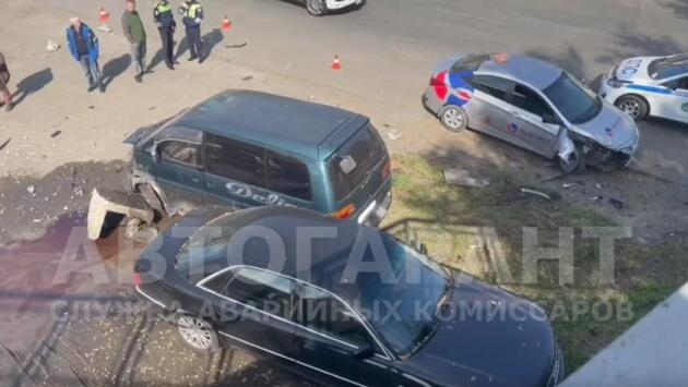 Как сообщает автор канала, водитель Mitsubishi Delica выезжал со стороны ул. Волжской и поехал прямо в сторону ул. Енисейской. Первым под удар попал Nissan Bluebird, далее микрик ударил учебный Hyundai, продолжив движение, он сбил пешехода и бетонные блоки и остановился об Audi. Пешеход признаков жизни не подает. Очевидцы сообщают, что рулевой Delica в сильном опьянении. На месте работают медики и ГИБДД.