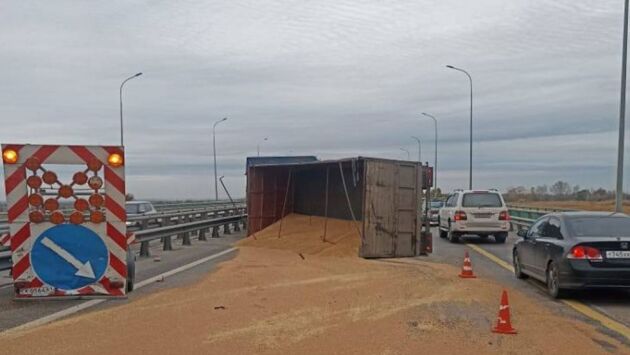 На М-4 «Дон» перевернулся прицеп КамАЗа с зерном