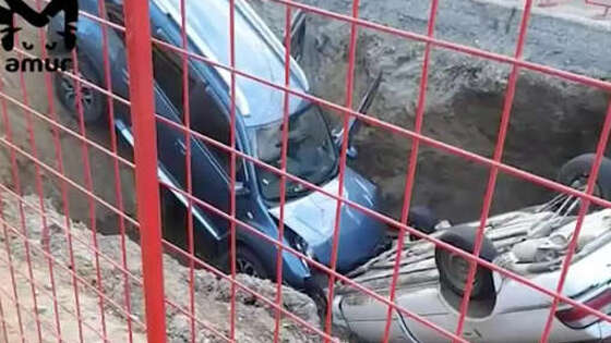 Два автомобиля свалились в глубокую яму в центре Благовещенска