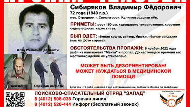 «С женщиной связались сразу после исчезновения пенсионера, но брат к ней не приезжал. Несколько раз ранее его находили по дороге в Янтарный, водители подбирали его на дороге и отвозили обратно в пансионат. Владимир Фёдорович не пьёт, прихрамывает на одну ногу, походка шаркающая, медленная. Если кто-то видел его в районе Светлогорска, Донского, Янтарного, просим сообщить нам по указанным телефонам. Пожилой человек нуждается в медпомощи и может замёрзнуть», — говорит Преснякова.
