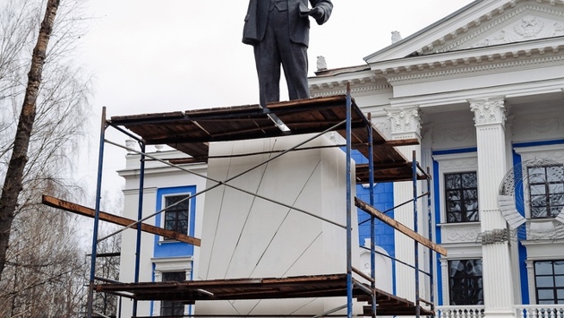 Продолжается ремонт пьедестала памятника В. И. Ленину, фасада и восстановление ограждения со стороны улиц Кирова и Советской.