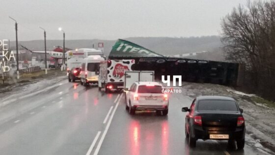 ДТП с фурой произошло вечером 18 ноября в Гагаринском районе Саратова. Как сообщили очевидцы в паблике «ЧП Саратов» соцсети «ВКонтакте», в селе Верхний Курдюм недалеко от памятника «Вертолет», возле мотеля «Автокемпинг», перевернулся на скользкой трассе длинномер. Прицеп завалился на правый бок, а его задняя часть сползла в канаву. В результате половина трассы оказалась заблокирована для проезда. По предварительным данным, во время происшествия никто не пострадал.