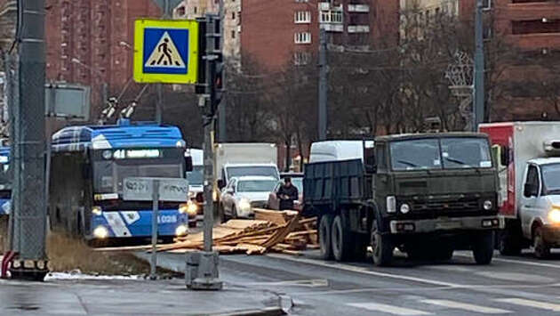 В Санкт-Петербурге "КамАЗ" завалил дорогу досками