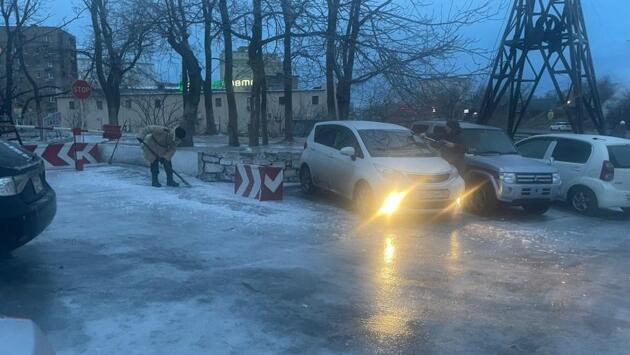 В Большом Камне машины на спуске, который покрылся льдом, не могут справиться с управлением и ударяются друг о друга. Как сообщают местные жители, на дорогах города автомобили устроили боулинг.