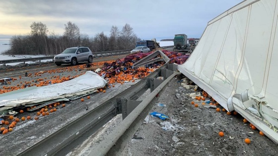 Сегодня, 11 декабря, трасса под Чебаркулем (Челябинская область) оказалась засыпана апельсинами в результате ДТП. Молодой автомобилист на "Вольво" наехал на стоящий "Камаз". Грузовик опрокинулся, засыпав трассу фруктами и перекрыв движение по одной полосе. Водители не пострадали. "На месте происшествия работают два экипажа ДПС, данный участок дороги имеет по две полосы для движения в каждом направлении", сообщили в Госавтоинспекции, отметив, что оказывают помощь в ликвидации последствий аварии.