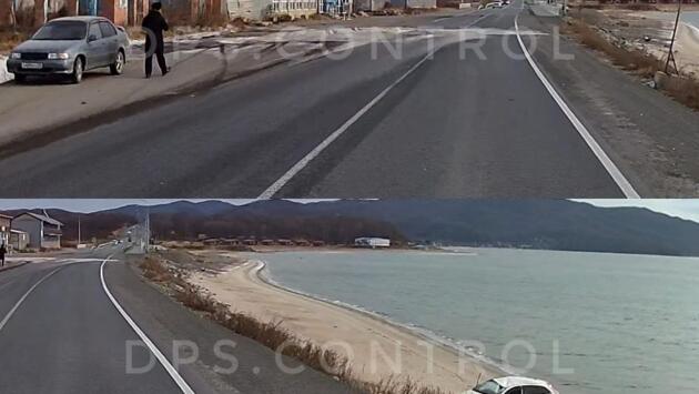 Со стороны Находки в направлении Фокино двигался автомобиль марки Honda Fit. В указанном месте он поскользнулся и съехал на пляж к морю.
