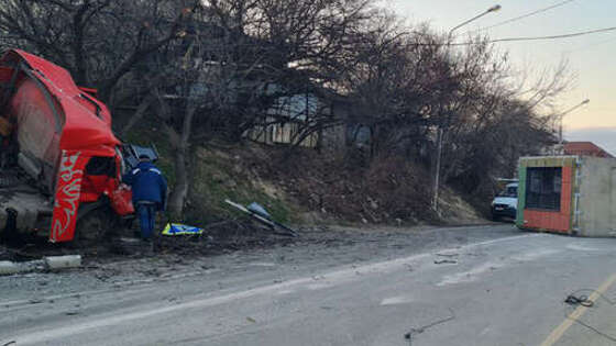 В Анапе тягач с трейлером, перевозивший квартирную секцию для строительства многоэтажного дома, врезался в дерево. Громоздкая бетонная конструкция при этом перегородила проезжую часть. Об этом сообщается в Telegram-канале городского ОМВД. "В ходе попытки остановить грузовой автомобиль, водитель допустил столкновение с несколькими автомобилями, двигавшимися в попутном направлении, после чего столкнулся со столбом и въехал дерево", - отмечается в сообщении полиции. По предварительным данным, ДТП произошло из-за того, что у большегруза отказали тормоза. На месте происшествия сотрудники ДПС организовали объездные маршруты. Ранее стало известно, что в Липецкой области грузовой поезд снес кабину самосвала на переезде.