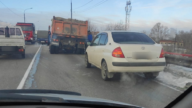 В Благовещенске на подъезде к мосту через Зею образовалась пробка из-за КамАЗа