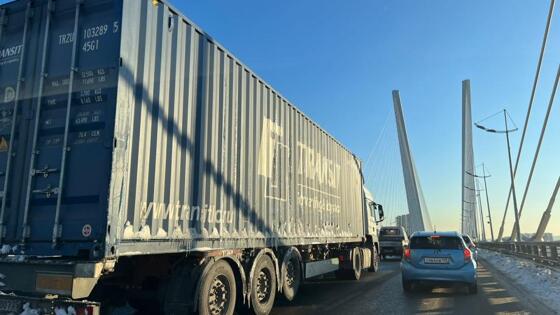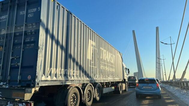 «Уже разрешили?»: во Владивостоке на Золотом мосту образовалась пробка из-за большегрузов
