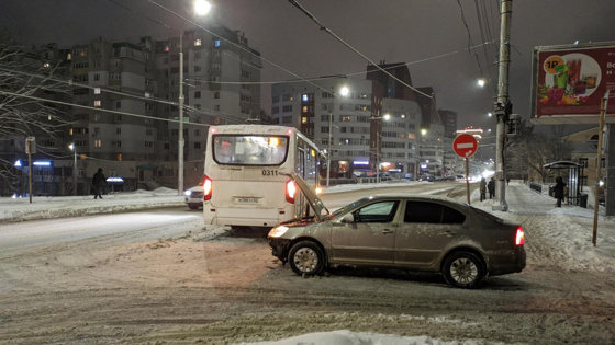 Судя по всему, водитель легковушки выезжал со второстепенной дороги и не уступил общественному транспорту.