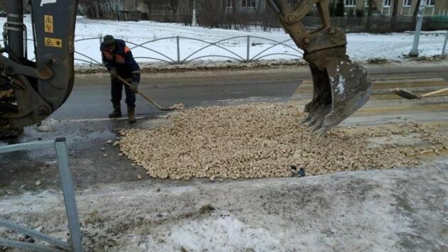Яму временно засыпали щебнем. В мэрии добавили, что когда настанут благоприятные погодные условия, этот повреждённый участок дороги отремонтируют.