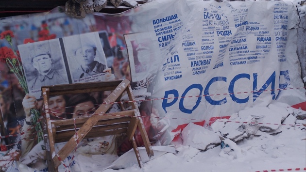 Однако оставлять неприглядную картину не захотели: чтобы не портить вид района, неизвестные приняли решение завесить гаражи баннером, на котором восхваляется Россия, а также изображены участники "Бессмертного полка" с фотографиями ветеранов ВОВ в руках.