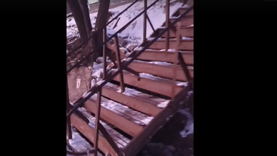 Накадрах видно новую многоэтажку, напротив неё расположена проезжая часть, ачуть ниже— ступеньки ктрамвайным путям. Пословам женщины закадром, пешеходного перехода надороге нет, остановочного павильона возле трамвайной линии нет уже давно, алестницу кнему огородили лентой ибордюрным камнем.