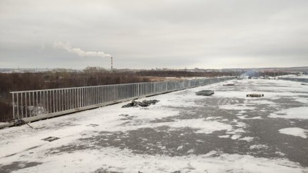 Сейчас на эстакаде монтируются перила, формируется грунтовой откос под лестничный сход.