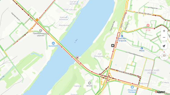 Пробка образовалась из-за массовой аварии на Мызинском мосту в Нижнем Новгороде