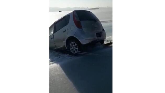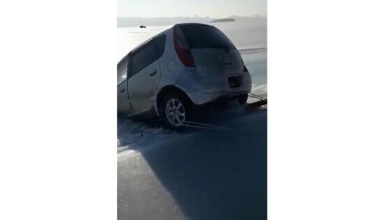 На нем видно, как иномарка ушла под лед передними колесами и частично вмерзла, в связи с чем попытки вытянуть ее так и не увенчались успехом.