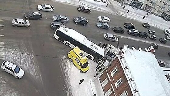 На кадрах видно, как два автобуса проезжают перекресток, не пропускают друг друга и сталкиваются. Один из автобусов, пытаясь уйти от столкновения, уезжает в сторону и таранит здание. Рядом с двумя транспортными средствами оказывается третий автобус, которому удается не попасть в ДТП.