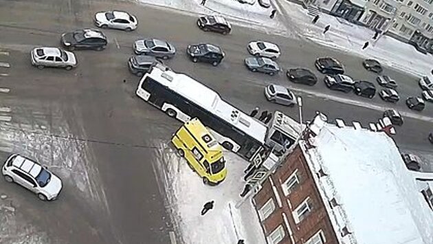В Уфе на пересечении улиц Цюрупы и Достоевского столкнулись два автобуса. Видеозапись момента аварии публикует Telegram-канал Mash Batash.