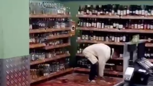 Разбив дверь магазина, посетитель решительно направился к полкам с алкоголем и начал яростно бросать бутылки на пол. При этом он не забывал периодически отпивать из какой-нибудь разбитой тары пару глотков.