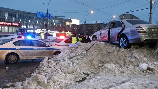 В Новосибирске водитель автомобиля марки Mercedes врезался в автобус на остановке.