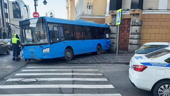 Авария произошла на Океанском проспекте российского города. На опубликованных кадрах видно, как неуправляемый автобус сначала катится задним ходом по проезжей части, а потом влетает в фасад административного здания. Оказалось, что это здание краевого суда.