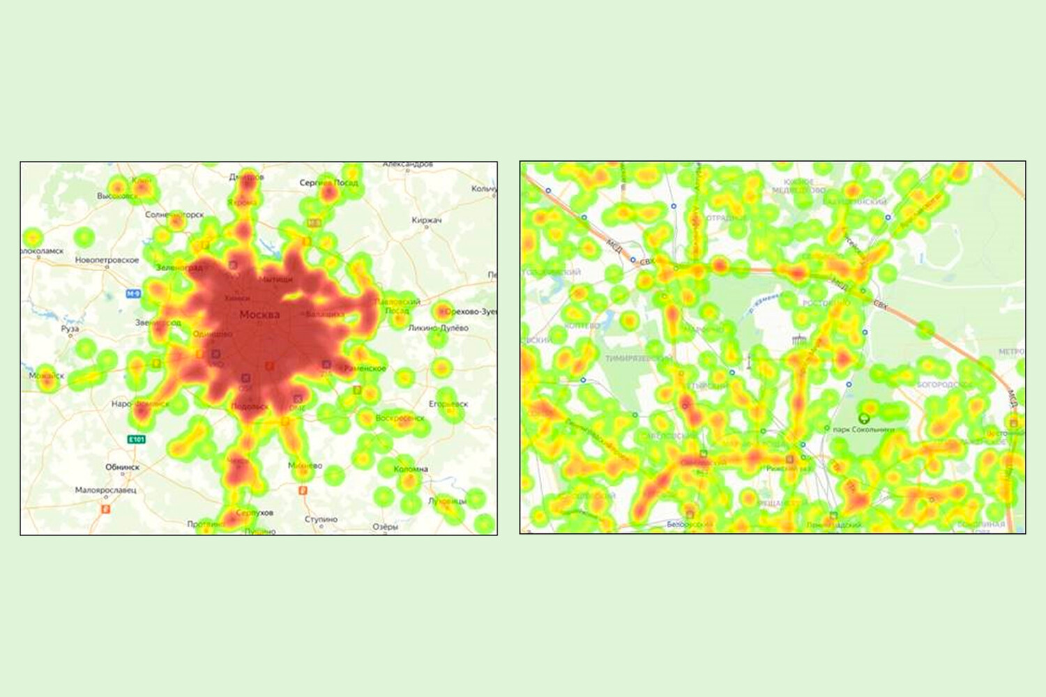 Согласно карте, повышенная плотность дорожных событий в Москве и ближайшем Подмосковье концентрируется в пределах МКАД, а также вдоль Дмитровского, Киевского и Симферопольского шоссе (иллюстрируется пятнами темно-оранжевого цвета).