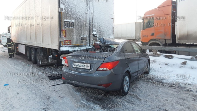 В Башкирии водитель Hyundai Solaris не справился с управлением и столкнулся с грузовой фурой