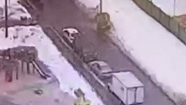 На кадрах видно, что автомобиль съезжает с проезжей части и врезается в столб освещения, после чего из него выскакивают пять человек. На этом запись заканчивается.