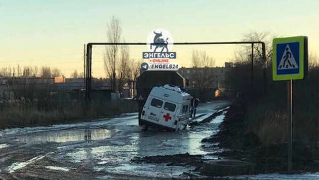В Энгельсе машина скорой помощи с больным увязала в грязи на городской дороге