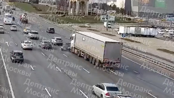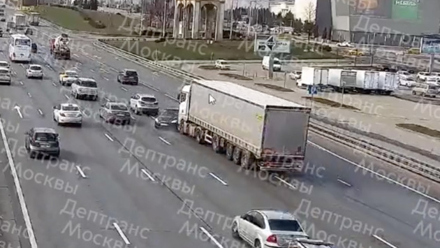 Столкновение фуры и легкового авто на МКАД попало на видео, опубликованное в Telegram-канале столичного Дептранса.