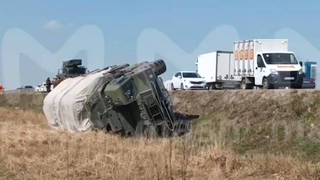 На кадрах виден ЗРК, который лежит на боку в кювете в стороне от трассы. По данным канала, машина перевернулась еще утром и лежала там до вечера.