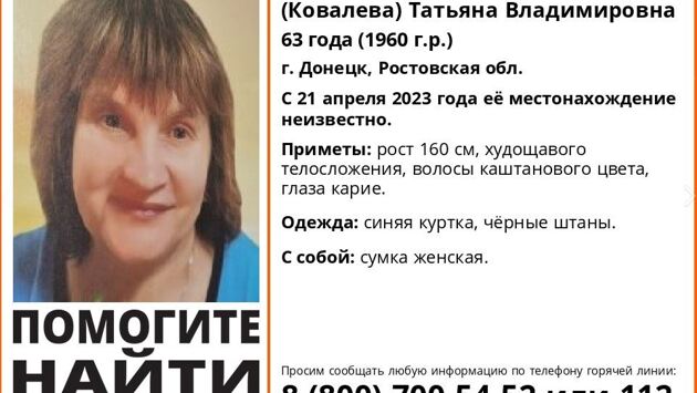Ростовская область, 22 апреля 2023. DON24.RU. В Донецке без вести пропала 63-летняя Татьяна Толстоусова. Об этом сообщили в поисковом объединении «ЛизаАлерт». Местонахождение женщины неизвестно с 21 апреля. Ее рост 160 см, она худощавого телосложения, у нее темные волосы и карие глаза. На ней были синяя куртка и черные штаны. С собой взяла сумку. Всех, кто видел эту женщину, просят позвонить по телефонам: 8 (800) 700-54-52 или 112.