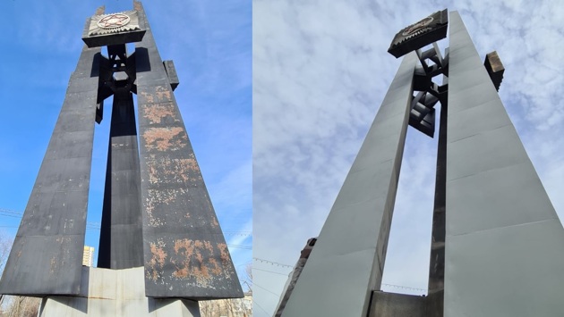 В начале апреля в мэрии сообщили о том, что стелу приведут в порядок до конца месяца. Подрядчик отремонтировал бетонной основание памятника, а также провёл пескоструйную обработку металлических конструкций, после чего их загрутновали и покрасили.