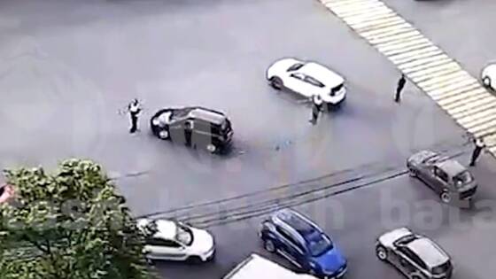 На кадрах автомобиль черного цвета выезжает на перекресток и на выходе из поворота сбивает стоявшего к нему спиной сотрудника Госавтоинспекции. Инспектора бросает на капот. После того как россиянка останавливает автомобиль, регулировщик падает на асфальт. К нему тут же подбегает сотрудник одной из городских служб, чей автомобиль припаркован на обочине.