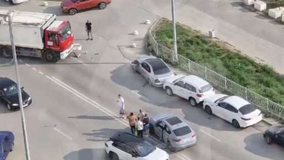 Отмечается, что ДТП произошло на улице Академика Вонсовского. Мусоровоз ехал по прилегающей территории, подрезал машину Geely, она врезалась в припаркованные автомобили. Всего повреждения кузова получили пять машин.