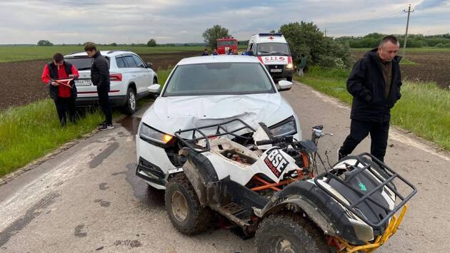 Отмечается, что за рулем легковушки в момент столкновения находился 65-летний водитель. Он не пострадал. Судя по фото, автомобиль Audi получил серьезные повреждения передней части. У него помят капот, повреждены решетка радиатора и бампер. У квадроцикла видимых повреждений нет.