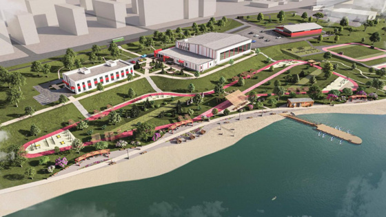 На береговой линии появятся песок, лодочная станция и пирс. Будут обустроены прогулочные зоны, спортивные площадки, беседки и скамейки. В проекте также есть озеленение.